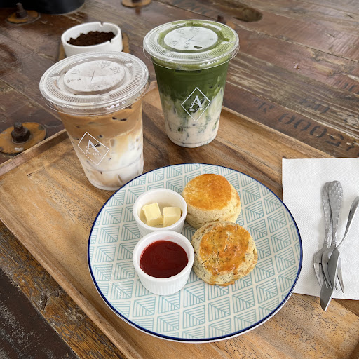 เราอยากมาร้านนี้เพราะตามรีวิว scones จากรูปต่างๆ ที่ลงรีวิวคือน่ากินมาก ที่เราสั่งไปมี 3 อย่าง คือ 1.Scones Set (125 บาท) ในเซ็ตประกอบไปด้วยสโคน 2 ชิ้น 2 รสชาติ เสิร์ฟพร้อมเนยสดและแยมสตรอว์เบอร์รี่ อร่อยมาก สโคนแป้งกำลังพอดี กินตอนร้อนๆ คือกรอบนอกนุ่มใน ปาดเนยเพิ่มความหอม ปาดแยมสตรอว์เบอร์รี่เพิ่มความหวานเปรี้ยว ถูกใจเรามาก 2.Matcha Latte (180 บาท) ทางร้านใช้มัทฉะ Hikari เกรดพิธีการ รสชาติจะขมๆ หน่อย เราสั่งไม่หวานเลย แล้วก็เปลี่ยนนมเป็นนมถั่วเหลือง (+30 บาท) 3.Coffee Latte (85 บาท) เมนูนี้ของแฟนเรา ลาเต้สูตรของทางร้านจะไม่หวานเลย ถ้าใครชอบหวานก็สามารถเพิ่มไซรัปเองได้ตามชอบ