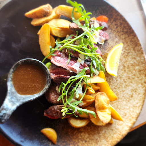 The presentation of the dishes is both inviting and sophisticated. The steak ( we ordered medium rare ) and potatoes are beautifully plated, with the vibrant arugula and shaved cheese adding a fresh touch. The meat's succulent appearance and perfectly cooked texture make it a standout, while the golden-brown potato wedges add a comforting, hearty element to the dish. We ended up order another portion because it was so nice.