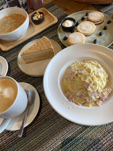Случайно нашли заведение, после поняли как же тут вкусно! Жаль, что не нашли раньше. Приходили 2 дня обедать. Возможно успеем прийти еще один раз. Заказывали вареники, суп куриный, борщ, пельмени с курицей, пасту с креветками. Все очень достойно. Заказывали зеленый чай, который заварили в чайнике, мы насладились этим вкусом , а не вкусом чайных пакетиков как во всех кафе и отелях. Тесто для вареников и пельменей - тончайшее, мясо вкусное, без большого количества лука, я бы сказала , что это даже намного вкуснее , чем нам подают в заведениях в России. После обеда никакого чувства тяжести не испытывали, если вы понимаете о чем я. Персонал приятный. Кафе чистое, подача европейская. Официант разговаривает совсем немного на русском, но все пытается понять. Повар девушка, разговаривает на Английском. Все, что не доели взяли с собой , аккуратно сложили в контейнеры. Ценник средний, вдвоем можно пообедать на 600-700 бат. В обед практически никого нет, вечером не ходили мимо. Очень советуем всем русским , кто устал от уличной еды, хочет привычного русского сервиса , чистоты и свежести. Желаю владельцу заведения и персоналу новых довольных клиентов и...