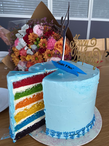 The vanilla and lemon zest flavor was perfect for the rainbow style and the frosting/icing elevated the cake flavors. Each colored layer was evenly placed with care. Frankly, it was a beautiful cake and I loved it and so did our office team. So yummy.