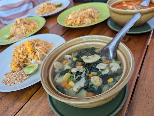Thum is a well-travelled, endlessly cheerful, and highly intelligent lady who speaks fluent English and French - and Thai of course! - and some Russian - and cooks all the food herself. She also understands words like "vegetarian", "gluten free" and "no MSG".