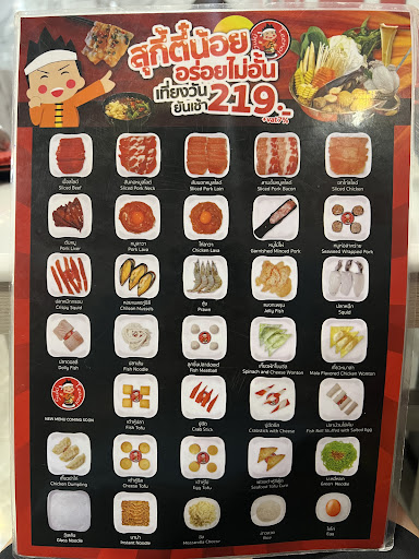 Read moreSuki-Shabu Buffet 2 Hours . Hot pot with Shabu soup and Black sukiyaki soup. 2 style sauce suki and seafood. . All you can eat: Sliced beef, Sliced Pork, Liver, Bacon, Sliced Chicken, Mussels, Prawn, Squid, Fish, Tofu, Noodle, Cheese, Rice, Egg, Mushroom, Corn, Wakame Seaweed, Vegetables and etc. . Price: 276฿ Net/person (Buffet 219฿ + Drink Refill 39฿ + Vat7%) . Open: Noon - 5AM Car...