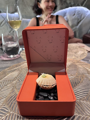 Read moreInteresting space as the name suggests, itâs a cave. We had a private room that seats 6 people. Itâs modern and edgy. Itâs all set menu, tonight the concept was âBrand Name.â Out first dish was serve in an Hermes orange box, it was a one bite of something. Then next a green macaron with treadle cream in the middle which suppose to be Dior. The third down was tomato fritter served on the bed of ginger granitas which suppose to be LV. Then Seabas couldnât remember what brand it represented. Followed by duck breast in beetroot, green sauce, and gold covered chestnut, this dish was Gucci. The portion was small they all taste interesting. The Chef came and explained the inspiration of the first few dishes for us. The desert was a grand finale which as raspberry and lycee combination. It was a great interesting experience, many conversation starters type dishes. The service was alright the price is not bad. Itâs a place to impress your date as the food wouldnât fill your stomach. Having mama cup of...