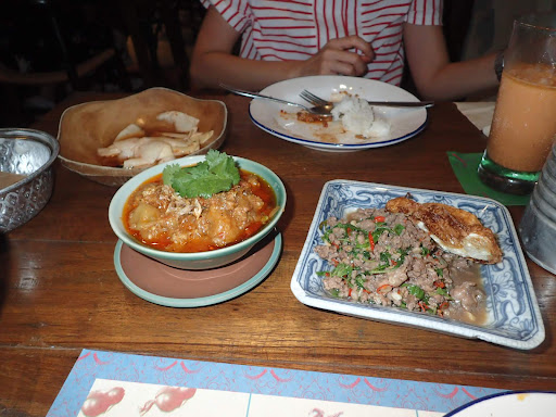 Letâs start with a green mango salad. It was very good but the portion was like very small. I was quite disappointed with the portion because in the pictures it looks quite On the menu. I ordered these rice balls deep-fried with macro in it. I thought it let me try something different and wow I was absolutely blown away my favourite of the lunch. We ended up ordering another order of the same! The beef kapow I didnât try, but my friend said it was very good, Usually it comes with rice, but there was no rice along with this, so we didnât order the rice. đ Presentation wise the chicken skin was very nice very nicely done with the dip but again itâs chicken skin and well. It was presented well what to say.