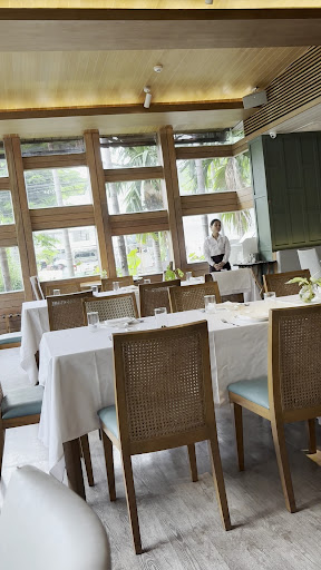 The restaurant has a very simple and modern interior. The ceiling is high, and the large floor-to-ceiling windows let in plenty of natural light, creating a bright and pleasant atmosphere.