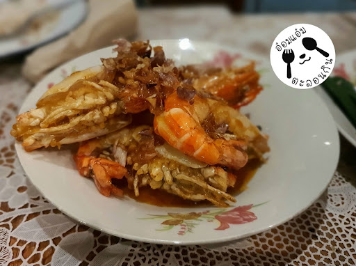 🦐 กุ้งทอดกระเทียม จานนี้ทางร้านจะทำแบบมีน้ำขลุกขลิก นำกุ้งไปทอดแล้วพักทิ้งไว้ จากนั้นเจียวกระเทียม ใส่ซอสพริกศรีราชา มะขามเปียก น้ำปลา น้ำตาล เคี่ยวจนข้นแล้วนำกุ้งที่พักไว้ใส่ลงไปคลุก โรยหน้าด้วยกระเทียมเจียว จานนี้ราคาจะไม่ตายตัวในแต่ละวันขึ้นอยู่กับราคาตลาด ได้มา 5 ตัวค่ะจานนี้ กุ้งเนื้อสดหวานดี ตัวน้ำซอสที่ผัดมาจะมีรสเปรี้ยวๆ คลุกทานกับข้าวอร่อยดีค่ะ
