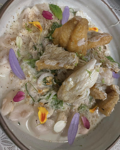 🦐 ข้าวตังหอม ทางร้านนำข้าวที่หุงมาต้มแล้วปั่นให้เป็นเนื้อเดียวกัน หยอดเป็นวงกลมและนำไปตากจนแห้งผัดกับสามเกลอใส่น้ำตาลปี๊ปและเคี่ยวกับเนื้อสับปะรด ทานคู่กับกุ้งขาวเผา ลูกพลับ on top ด้วย ใบโหระพา ใบสะระแหน่ ใบมะตูมแขก เนื้อส้มซ่าและผิวส้มซ่า เริ่มจานแรกด้วยเมนูเรียกน้ำย่อย มี 5 คำ สำหรับจานนี้ต้องทานในคำเดียว ข้าวตังกรอบๆฟูๆไม่อมน้ำมัน รสชาติอร่อยถูกปาก รสกลมกล่อม หอมใบเฮิร์ปที่ใส่ on top