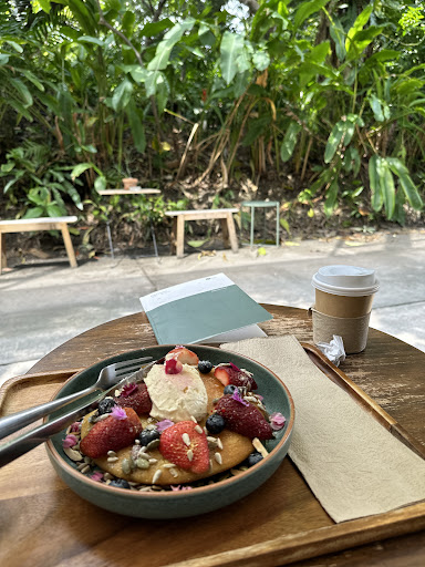 Read moreCharming space inside one of Bangkok’s ubiquitous soi. Excellent pancake that is fresh and topped with good quality strawberries, blueberries and seeds, very fresh cream and an edible flower whose name I do not know. Would have given 5 stars if not for the disposable coffee cup, and music that’s a tad too loud to be background music. Sitting outdoor, I have hoped to escape the music but there is an outdoor speaker…perhaps cafe should also sell some silence…or perhaps it’s just me at this moment craving for some calm. Will definitely come back though…it’s a great space, with excellent food and...