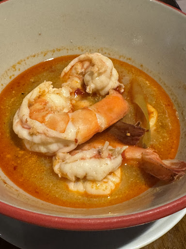 Tom Yum Goong Big, juicy prawns in a hot and sour soup. The flavor is rich and well-balanced — spicy, sour, and creamy. It’s served hot and freshly made every time!
