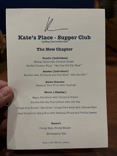 Read moreChanced upon this little gem whilst searching for a nice restaurant to celebrate my wedding anniversary. Cosy and unpretentious, the focus is all on the fantastic food! The 3 starters (or snacks as stated on the menu) were 3 separate dishes, each one filled with complex tastes that belie the simple presentation. The duck breast starter was succulent and was served on a bed of wonderful homemade laab achar. By the time the mains were served (communal style served withThai brown rice), we were stuffed but the dishes were all so wonderful that we finished everything! Especially commendable was the herbed fermented soya bean with minced pork, spooned onto the organic raw vegetables served. Yum! The sweet ending was a deconstructed Kate-version of the classic mango sticky rice - to die for!! If you thought you “knew” Thai food, you HAVE to experience Kate’s heartfelt renditions of classic Thai dishes, and her mastery of balancing the herbs and spices was perfect. Unlike other chef’s tables we have experienced, the food servings were so generous that I think hub and I over ate. Lol! Go and try Kate’s place while you’re still able to get a...
