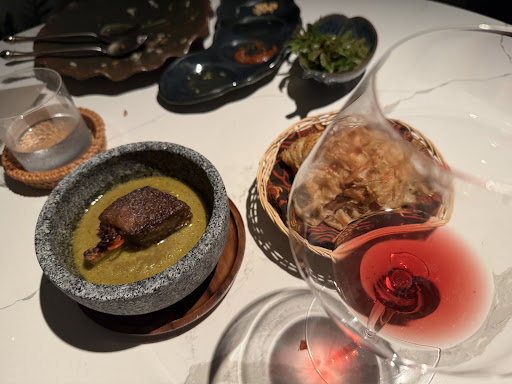 The evening was a deep dive into Southern Thai cuisineâspicy, vibrant, and unapologetically rooted in tradition. From the very first bite (a fiery one-bite amuse bouche packed with prawn, vinegar, cilantro, and prawn fat), it was clear this wouldnât be a typical fine dining experience.