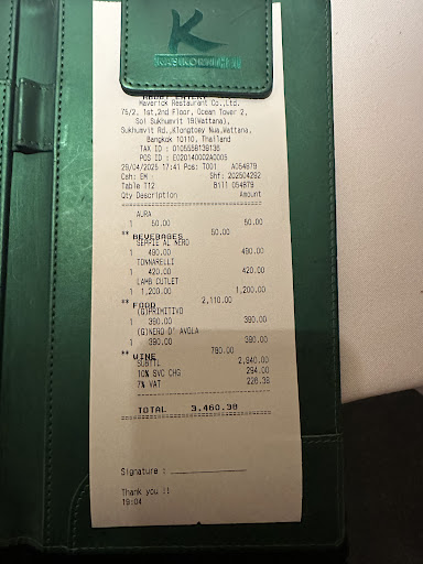 Read moreGone downhill already, not impressed. I was looking forward to my third time at this restaurant. Started with a 400ml beer which was served in a 300ml glass. It was filled a couple of ml over the 300ml line. I assumed they had accidentally used the wrong glass. I asked the waitress for 400ml. Normally I wouldn't bother but at 374 Baht it is one of the most expensive beers in Bangkok. It came back unchanged. I asked to see the manager. My beer was then taken away and filled completely to the brim, beer pouring over the side. Well that is one way to do it. Next we ordered a bottle of wine. To be fair they have a good variety of well priced wines. This is their only positive. I then had the misfortune of eating their food. I ordered a octopus pasta which was the saltiest inedible thing I have ever tasted. Like some one had accidentally put an extra cup of salt in. 679 Baht? Get real. Prices included compulsory service charge. No other way they...