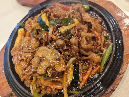 But the Kalbi is really soft, juicy and flavorful. I asked them to cook it in the kitchen. The seafood pancake is good. Crispy on the outside. The spicy pork is also really good. There is another restaurant that I reviewed with similar flavor of the spicy pork. The kimchee is different than typical kimchee. It is crunchy and it's probably not preserved....