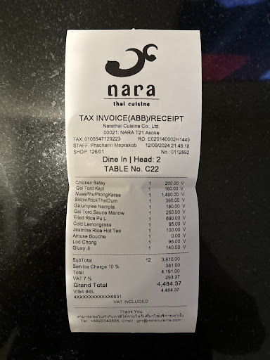 Very very steep in price for thai food. Had about 4 main dishes, starters and dessert. Total bill inc VAT 7% and Service charge 10% was approx $4500 baht