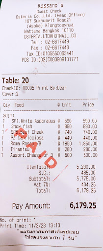 Read moreAfter a long time stuck in traffic, we were happy to arrive at this traditional Italian restaurant. It is very classically furnished, very large and unfortunately a bit dated. The staff are very friendly and professional and you are in very good hands. The menu offers a wide range and fortunately there is also a daily menu and a reasonably priced set menu. The food is good, but don't expect a gourmet experience. The wine list is also extensive, but the prices are too high. That gives 4 stars. But unfortunately I have to deduct a star. We ordered a pizza to take home (at 440 ++ baht more expensive than in Italy) and they charged us a service charge even though it wasn't served. This has never happened to me in Thailand before. It is a dishonest, unacceptable practice and we will not go...