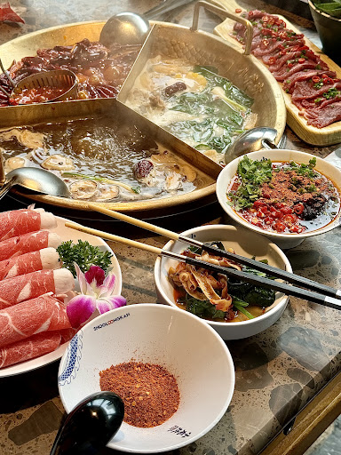 A large, beautifully decorated restaurant with a cozy atmosphere. The broth options are diverse but come at an extra cost. The mala broth allows you to choose your spice level, though even the mildest option is still quite spicy. The sauce and side dish bar is somewhat limited. The fresh vegetables, pork, beef, and offal are of good quality, and the minced shrimp is delicious, but the rose-shaped fish ball is a complete miss.