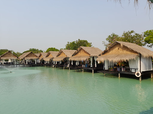 Lovely restaurant area, based on many raised platforms with extended netted areas to lie on directly above the water, great for relaxing and eating, dotted around a lovely turquoise coloured water feature with many large fish swimming around and being fed by visitors, good, friendly staff delivering food on Segway’s or electric golf carts, fast service, food was lovely and definitely worth the visit, relaxing background music playing & popular with Thai families with children, all platforms are laid out with a Low ‘Japanese style’ table and some cushions to sit on, they also have a 4-person sofa for chilling on and a plug-in fan if you need. Very well laid out place and definitely worth the visit for sure,👍 we would visit here again for sure if in the area....