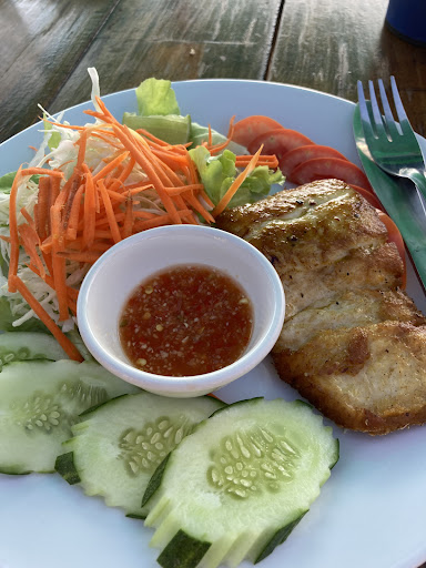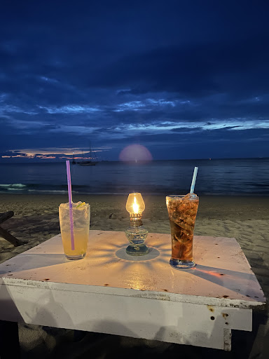 Nice location/beach front you have your choice of seating on the balcony or downstairs in the sand. I ordered a grilled barracuda fillet that was ok; J’s fried fish pad Thai was amazing! Clean with prompt attention. Happy Hour 5-7pm with 100baht cocktails. John got a mojito or caiparniha but the differences are ill defined here on Koh Lanta/Thailand in general I’m guessing. With dinner, J shared a margarita, served in a wine glass with a salty rim. Beach swims continue as a way to cool off. It was a fab sunset. I was very comfortable after moving from table for dinner to the sling chair. It was taunt and back content. 800 baht! $17, our priciest meal to date, but for beachfront, great food and service,...