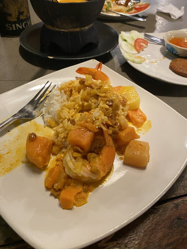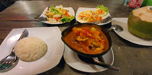 By the looks of the restaurant, it suggests that it's a simple hole in the wall place, with ramshackle jet charming dÃĐcor. However, the prices were surprisingly steep for portions that were hardly more than appetizers. This might have been acceptable if the food had been exceptional, but unfortunately, it fell short in flavor as well. The Massaman curry lacked depth and was disappointingly watery. Even the novelty of serving it in a coconut shell couldn't distract from its small size and lack of taste. Similarly, the fried squid with baby corn was overwhelmingly seasoned with Maggi seasoning, leaving no room for any other flavor to shine through. The best part of the meal was the Som Tam (Pappaya Salad) which at least had some Thai flavours and also a bit of spice. Regrettably, this dining experience stands out as the worst we've had in our eight weeks of travel through southern Thailand. And it was at least 50% more expensive than what we normally would pay for these kind of dishes (not even factoring in that the portions were small).