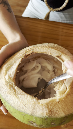 Las tostadas con mantequilla, mermelada y crema de cacahuete fueron el complemento perfecto, ofreciendo una mezcla de texturas y sabores que nos encantó. Por último, pedimos un coco fresco, y la experiencia fue un auténtico lujo: primero disfrutamos del agua de coco, dulce y refrescante, y luego nos abrieron el coco para que pudiéramos comer la carne fresca y tierna, ¡una delicia sin igual!