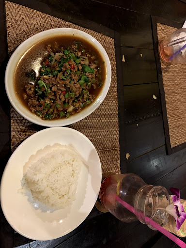 Read moreThis was probably our favorite restaurant in Ko Phi Phi. Upon arrival, we had to remove our shoes (no big deal) and they told us it was busy so it would be about a 40min wait for food, which we didn't mind. Service was great and we appreciated that they let us know ahead of time. They also helped us by recommending dishes & helping us choose our spice level. For drinks, we got strawberry daiquiris and margaritas. Both were freshly made & delicious! Probably the best daiquiri & margarita I had ever had. The margarita was made to taste - you got to sample it & let them know if it needed more sugar. For food, we got spring rolls, papaya salad, and the chili & spicy basil pork. The papaya salad was insanely spicy, but the main dish wasn't quite as bad. The rice came out shaped like a heart for the ladies, and like a flower for the men, which I thought was a nice touch. The service and food was amazing - I would highly recommend this to anyone...