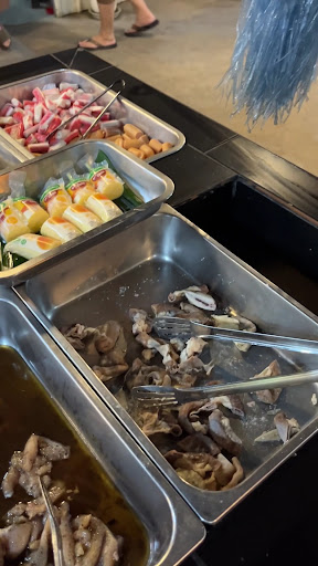 Me and my girlfriend passed this place yesterday and pulled over intrigued by the amount of locals eating here. We stopped in, a little nervous as there was no English menu and we didn’t know what we were doing, what it cost or what anything was! Anyway, we sat down and the lovely owner and staff brought us some utensils and plastic cups and we were guided by the locals on what to do. You fill plates with the items in the various stations and they eventually bring you two cooking apparatus, one a BBQ and the other a soup bowl with broth. The food varied from leaves, noodles, sauces on one station (soup), to the starter section which comprised of chicken, cous cous (maybe?) and more sauces, then all the meats and seafood (which have no names). You then cook the items on the BBQ and grill.