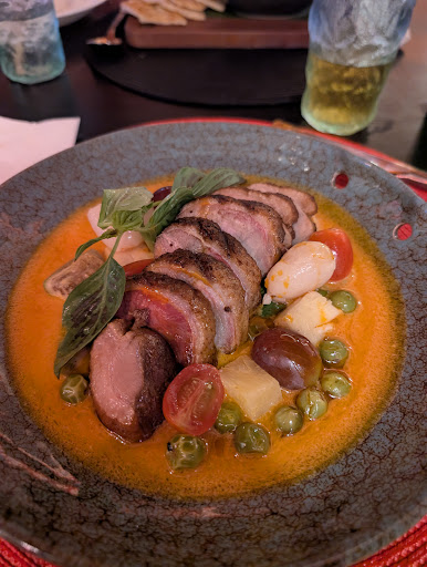 El curry rojo con magret de pato: potente, aromático, con la carne jugosa y perfectamente sellada. Un 10 absoluto.