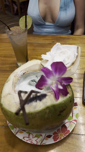 We had excellent drinks, mango Mojito‘s, and a singha beer, and finished it off with a blue margarita. We got chicken eggrolls that were crispy and delicious, a red curry in a coconut, and an entire whole fish with fried crispies on top. They came with a variety of different, sweet, spicy and sour sauces, and the entire time, the music, aesthetic, and Bartender really gave us a happy, welcoming vibe.