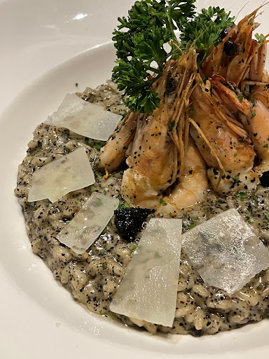 There is a menu of starters, pastas, pizzas, and mains, with an emphasis on seafood dishes. The prices are a bit on the high side but it's similar at others in this area. My dinner for one, including imported sparkling water, pasta main, and tiramisu dessert came to 900 baht (about US $30). The beef linguini in cream sauce was okay...if a tad salty and undercooked. The tiramisu was defrosted from the freezer and not freshly made. The service is attentive and the location on the...