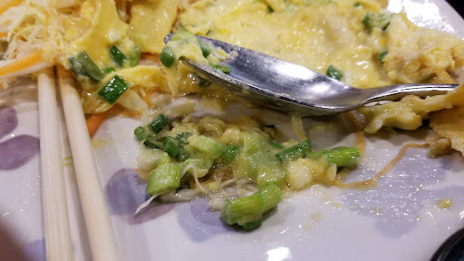 THAI OMELETTE (3 EGGS) SCRAMBLED W.GREEN ONIONS. REAL GOOD EXCEPT THE MIDDLE WAS STILL RAW AF SO WE DIDNT EAT IT... 4/5