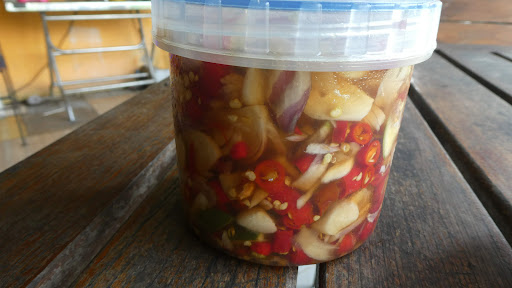 The food prices are the lowest I've seen in Thailand, 60b for a pad krapow. I opted for the beef version for a little bit more. The food was good. The fried egg was runny, the way I like it. The melon soup was surprisingly robust. Add as much of the chillies and garlic in fish sauce as you like, and the krapow really has oomph.