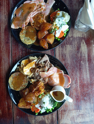 The not so good points:- The beef was overcooked & tough. The honey roast ham looked & tasted like rashers of thick bacon. Somebody forgot to put flour in the Yorkshire puddings. The roast potatoes were not cooked through. White sauce (?) poured on the vegetables tasted weird. Very small jug of gravy. Not sure what the circular patties were. The third waitress (in white t-shirt) clearly did not want to be there. Sadly she was clearly very tired, she hardly spoke to her more affable colleagues, she barely spoke to customers and just looked thoroughly miserable.