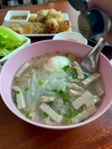 The soup is served hot with soft noodles and your choice of meat or tofu. It's a big bowl of comfort that fills you up and makes you happy. The restaurant feels friendly and relaxed, perfect for hanging out with friends or family. The decorations are simple but nice, giving it a cozy vibe.