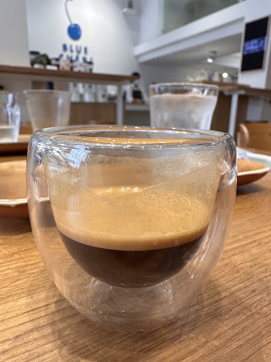 Ordered an espresso (fresh blue), dirty latte and a raisin swirl danish - later on add another espresso (house blue).