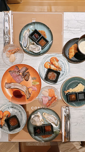 Read moreWell known ayce with different packages offered. Quality of food was excellent. Reservations are needed for this place. Do not think walk-ins are even entertained. I reserved lowest tier package. For me it is enough. Unless you want the lobster. Once you have your reservstion, arrive 10-15 min earlier than your tjme slot. You join a queue to get your table and I saw some pay their balance or do some add ons. I paid mine full when I booked. They assign your table and wait for them to announce your time slot to enter , find your table and eat. Quality of food is good. They have several stations for the food with the entry to the stations clearly marked. Oysters were popular, some sushi rolls are ordered and delivered to your table on individual plates that looked like rock containers. They have glasses on the table for you to get your drinks. They do have soda fountains, water and coffee cups are stocked near the coffee machine. They also have a bar, where you bring your own glass, place it in the copper mug and the " bartenders" (they do not dispense alcohol) give you your choice of drink which are fruit punch, honey lemon and other type of juices. My favorite is the truffle soup with a side of croissant. Flavorful, savory, umami. Salmon sashimi is fresh and had several of those. One thing I can say, is be careful when you start walking, a lot of people are not paying attention, busy taking photos with their phones, or rushing to get food that I almost got bumped while holding plates. The stations have smaller signs and sometimes it's hard to figure out what they are serving, especially if it's your first time there. They also have made to order desserts in small bite size servings like toast with salted egg, cute chocolate molten lava cake and the dessert station had delicious cheesecak, macarons, hazelnut tartlet (loved this one) and some panacottas. Copper is not cheap. Almsot $50/person for thailand. They boast as the best in the country. A good place for special occasions but come on an...
