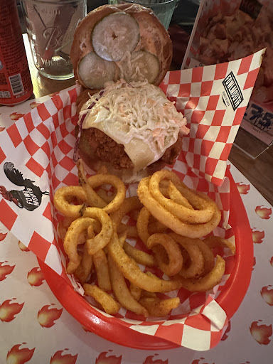 I had the Hot Chicken Burger with seasoned curly fries and an order of fried pickles. The chicken burger was a large breaded chicken breast that was cooked perfectly. It is very easy to ruin a sandwich with an over cooked rubbery chicken breast but here it was done perfectly. The only problem is the burger bun wasn’t able to hold up to the juicy chicken with the comeback sauce. This is to be expected.