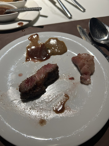 Wagyu Carpaccio was very odd. It was warm and rolled up around some chopped lettuce. Unfortunately they added something sweet to the sauce they glaze it with and it ruins the steak flavor. Most carpaccio is traditionally cold and the point is to enjoy the natural flavor of the beef. This wasn’t a carpaccio but a thin single piece of haldheld flamed Wagyu for $30 usd. Terrible. Cesar salad was decent flavor but sopping in dressing. Again likely lack of training or a chef actually tasting items occasionally to check quality. It was so soggy. You cannot order any meat less than 300 grams. That is 11 ounces, which is a huge portion. If you want a good small 6 ounces filet you are out of luck. Very odd and strange way to force you to spend so much. To make matter worse ordered Medium Plus. It’s such a big thick cut at 300 grams it came medium rare. I could See in the Kitchen we were the only steak cooking. How can they mess this up? Lack of training. Lack using thermometer if they are not good at temp grading. Just poor management.