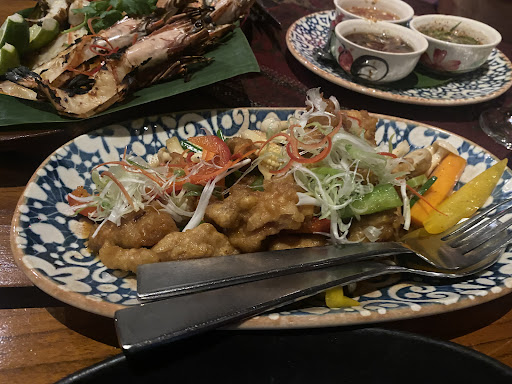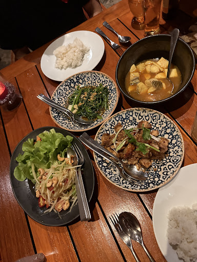 We were initially served taro crackers. We ordered a variety of dishes to share. We shared out with Miang kham which is betel leaf and a mixed of herbs and dried shrimps. I like this dish but it was quite a large amount. Next we had the pandan wrapped chicken which was smaller in portion but also very tasty. The chicken tom kha was creamy. The massaman beef cheeks were superb and the meat was so tender. The vegetarian green curry was average and the deep fried seabass was actually also very nice. To end the night we had the mango sticky rice which was not too special. They also gave us a dessert each which was tapioca and coconut.
