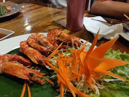 We wanted good shrimps 🦐. Definitely the wrong place for it even Thailand is famous for seafood. We ordered the grill big shrimp (pictured). 7 large shrimp. Ok size, seen bigger ones. Anyways, size isn't matter as long as quality is good. First thing we noticed is the shrimps shell is sticking with the meat. First sign showing they are SUPER not fresh or even old. Second, the body of the shrimp are soft, not firm and breaks down. Definitely old frozen for a long time. They are all tasteless. Total fail. And... Did I mention it is the more expensive dish @$250B. Others average at 120B per dish (same as others in the area).