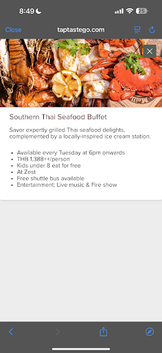 Came here for the seafood buffet shown on the Marriott dining experience. Thinking this is by Marriott it should be pretty good right? Well I expected a decent seafood buffet (as from the photo) with that price. But I was super disappointed when I arrived to see these seafood. The prawns are not fresh, crabs are not there and the seafood spot it’s just one small table area outdoor. I didn’t even see or try the grilled squid when I was there for an hour. The overall experience it’s just super disappointing having to wait for seafood that is not fresh, empty trays because each time they refill it’s only by small portions. All the other foods are cold. This buffet started at 6 we came at 6:10 and the foods were already cold and the “seafood” trays were empty 85% of the time. I honestly felt like I was scammed 😩 let this be my lesson to not look at the images only and lower my expectations when it comes to buffet by The...