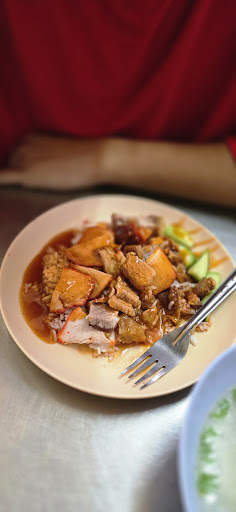 It is a restaurant with red pork rice that is not expensive.