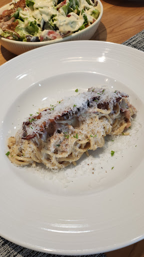 ✅️ปีกไก่ทอด ทอดได้กรอบ ไม่อมน้ำมัน เนื้อไก่นุ่ม รสชาติกำลังดี ✅️พาสต้า pappardelle bacon truffle ซอสครีม อร่อย รสชาติเข้มข้น ✅️สเต๊กไก่ซอสหัวหอม อกไก่ค่อนข้างแข็ง มี texture กรึบๆแปลกๆ ให้ซอสราดมาเยอะมาก น้ำสลัดอร่อย