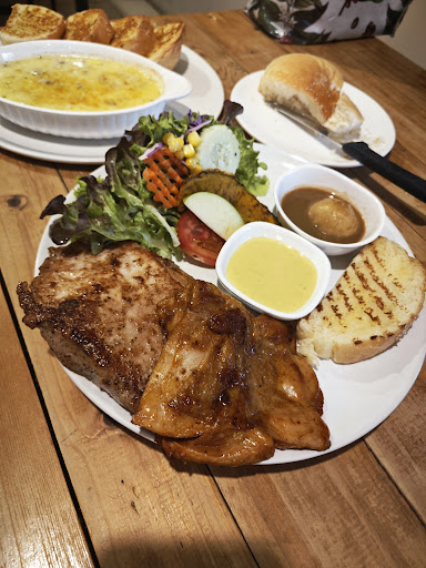 สั่งสเต็กหมูมา 1 ชุด เสิร์ฟพร้อมเครื่องเคียงแน่นๆ อีกจานเป็นซุปเห็ด ขนมปังกระเทียม เข้ากันสุดๆ