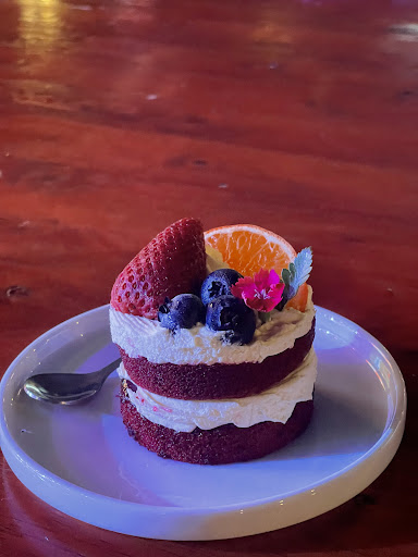 You can buy cakes from the café and enjoy them in the dining zone, which is really nice. I ordered the red velvet cake and it was delicious — the cream cheese frosting with fresh fruit balanced the flavor perfectly. The food in the outdoor chill zone wasn’t my favorite though, as the fried items were a bit oily and not so crispy. But overall, the atmosphere and service are good and it’s still a nice place...