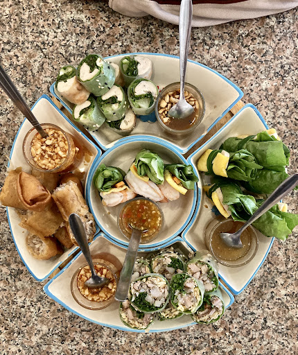 แต่… ก้นั่งรออาหารไปประมาณ ครึ่งชั่วโมง เพิ่งเริ่มได้จานแรก นั่นคือ ปอเปี้ยสดกุ้ง!! (เมนูนี้ปกติตามร้านอาการเวียดนามไม่เกิน 5-10นาทีต้องลงโต๊ะละ) ซึ่งผักขมมากๆ แป้งเหนียว และน้ำจิ้มหวานสุดๆ