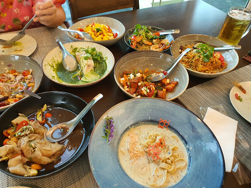 เฟตตูชินี่ทรัฟเฟิล แซลม่อน – พาสต้าเส้นเหนียวนุ่ม คลุกเคล้ากับซอสครีมทรัฟเฟิลหอมละมุน ท็อปด้วยแซลมอนชิ้นโต รสชาติกลมกล่อมและหอมทรัฟเฟิลอย่างลงตัว สปาเก็ตตี้เพสโต้ทะเล – เพสโต้ซอสหอมสดชื่น คลุกเส้นอย่างพอดี เสิร์ฟพร้อมกุ้ง หมึก หอย สดๆ จากทะเล รสชาติเข้มข้นแต่ไม่เลี่ยน ปลากะพงยำมะม่วง – ปลากะพงทอดกรอบนอกนุ่มใน ราดด้วยยำมะม่วงรสเปรี้ยวเผ็ดหวานพอดี โรยถั่วลิสงและหอมแดงเจียว ทานคู่กันแล้วลงตัวมาก นอกจากนี้ยังมีเมนูอื่นๆ ทั้งของทานเล่น อาหารไทย และของหวานให้เลือกหลากหลาย เครื่องดื่มก็ครบทั้งม็อกเทล เบียร์ และไวน์