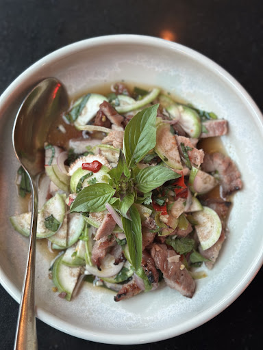 Spicy Grilled Australian Beef and Thai Eggplant Salad Grilled Pork in Wild Betel Bush 3.Stir-Fried Squid with Ink Sauce and Shrimp Paste