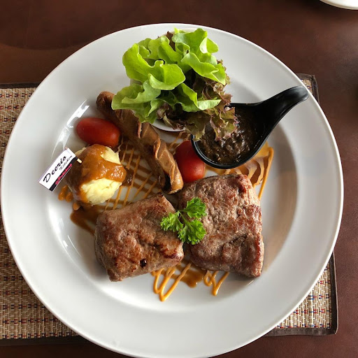 อาหารรสชาติดีมาก ผมสั่ง สปาเก็ตตี้ขี้เมา และสเต็กกวางมาลองชิม การจัดจาด การนำเสนอยอดเยี่ยม ความสวยงามผมให้เต็มเลย การทำความสุขค่อนข้างถูกต้องแต่ทางร้านไม่แน่นำwell done เพราะกลัวสุกเกินไป แต่พอออกมาเป็นสุกปานกลาง เนื้อสัมผัสความนุ่ม ความฉ่ำของเนื้อดีมาก ราคาธรรมดากลางๆไม่ได้แพงมาก เนื้อใช้เนื้อแช่แข็งมาทำซึ่งอาจใช้เวลาในการพักเนื้อนานหน่อย สปาเก็ตตี้รสชาดเยี่ยม มีเครื่องเคียงคือสลัด และขนมปังกระเทียม น้ำเปล่าใช้ของที่ร้านติดแบรนเอง