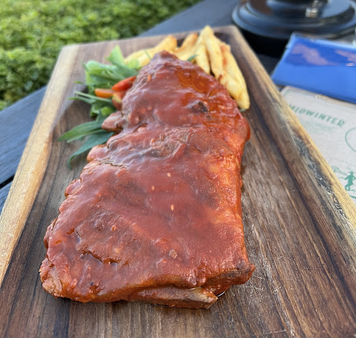 -Pork Ribs With BBQ Sauce. Ribs were well seasoned, tender, sweet and smoky. Paired well their blend of BBQ Sauce and chunky crispy potato fries with fresh salad greens.