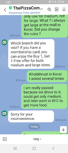 I am still mad that my Pizza Company in Khokruat Korat insisted that I cannot use my club card to buy LARGE PAN with the 2 for 1 offer. I complained with Bangkok HQ via Line (they are very friendly), and then the shop must have SHADED THE TRUTH and said that I tried to order NEW YORK STYLE. I said it 10x, in Thai and English, been there with my son. No misunderstanding possible!!! Kids do not want to go back because they are embarrassed about being sent away by staff again. Ok, no pizzas from...